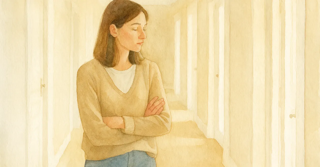 Nachdenkliche Frau steht im Flur vor geöffneten Türen. Symbolbild für Partnerwahl und Partnersuche, Entscheidungen und verpasste Chancen im Leben.